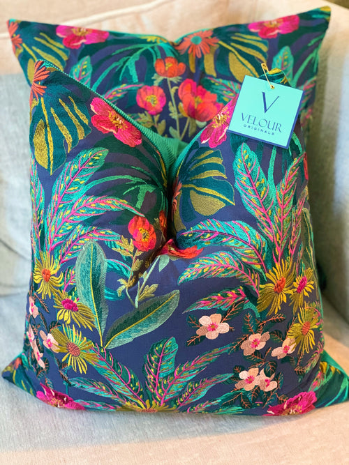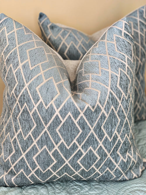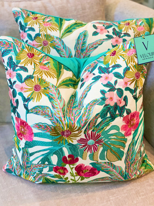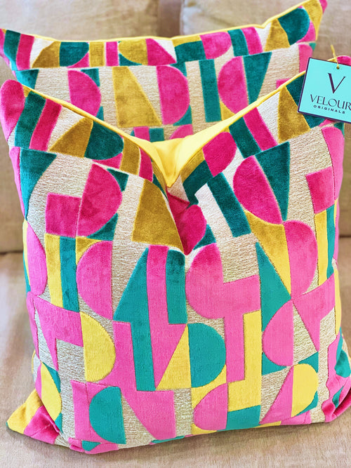 Red and Turquoise Cut Velvet front with solid turquoise velvet back.  Pillows are 22' with hidden zippers and filled with feather down inserts.